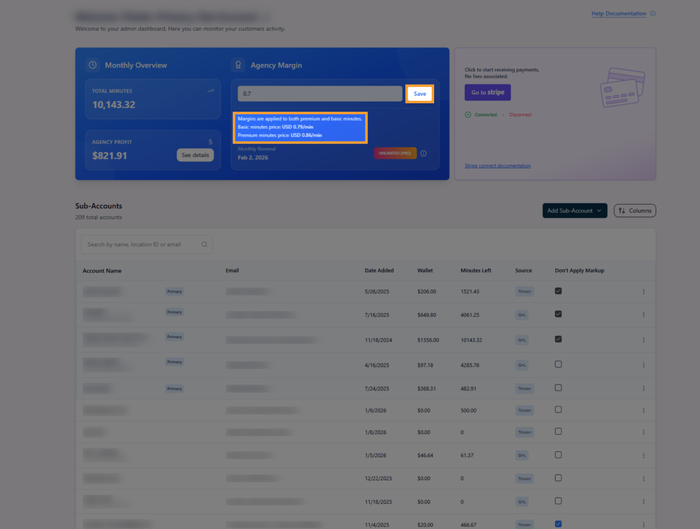 This feature allows agencies to generate additional profit from pay-as-you-go minute purchases while ensuring transparent pricing for their clients. Let’s explore how Margin Settings work and how to configure them effectively. thinkrr Voice AI uses a dual-tier minute system: Premium minutes at $0.16/min and Basic minutes at $0.09/min. Agencies earn profit based on markups applied to the underlying base cost of each tier.Markup for Sub-Accounts