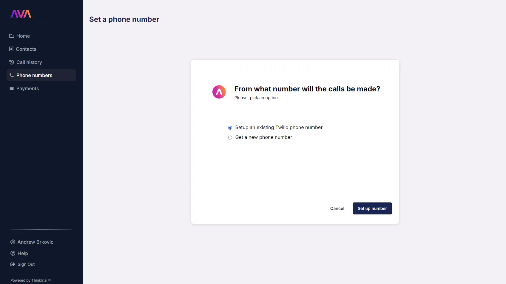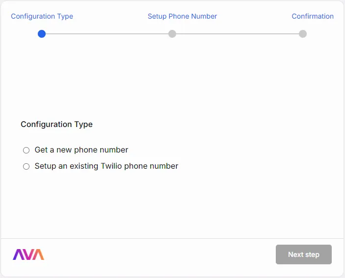 During Initial Setup: After signing into AVA for the first time, users are prompted to redeem their free AVA phone number or import a Twilio phone number.
